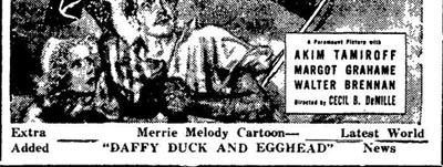 Tex Avery's swan song with the duck is another home run, and thankfully one that eschews the hunting motif. Daffy isn't so much screwy for screwy's sake as he is reacting to his rejection by I.M. Stupendous (although in all fairness, the opening scene is just a goofy way to say, "And now Daffy is at a movie studio."), which makes his antics a little milder and more grounded than in previous shorts. When the duck isn't on screen, the short simply plays out like a satire of the Hollywood studio system, with Von Hamburger taking center stage as the pompous archetype. Avery's use of actual stock footage for Daffy's "film" is pretty inventive and helps sell the idea that this was something cobbled together and that we're seeing a vandalization of an actual motion picture--if it had all merely been animated then it would have instead come off like the studio's typical newsreel spoofs (Nutty News, Porky's Snooze Reel, etc.). (To say nothing of the fact that Gold Is Where You Find It is the title to an actual but nearly forgotten Michael Curtiz western released around the time.) Some of the clips are lame and corny (the talking lion), while others are strangely enjoyable (the crashing plane, the boxing match). The cartoon's "what goes around, comes around" ending is a little hokey and more or less expected, but the fluid animation of larger-than-life Von Hamburger flailing about is fun to watch. It definitely echoes Egghead's similar breakdown in Daffy Duck & Egghead, so whether Avery was trying to make it a running gag in his Daffy shorts that the madness was contagious, we'll never know. It would have been wonderful to see what else the director could have done with his first star character, but thankfully for everyone he had a greater, grayer destiny before him.